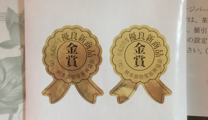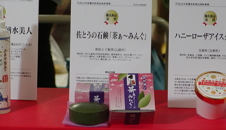 8月4日に、熊本の鶴屋百貨店にて新商品の表彰式が行われました。 『茶ぁ~みんぐ』が、本年の熊本県優良新商品審査会において、 民工芸・日用品部門で、見事『☆金賞』を受賞する事が出来ました。 洗顔石鹸としての使用感の良さと使用後の肌の潤いに加え、頭皮のケアやニキビ肌の改善等、 品質の良さが画期的な石鹸として認められました。