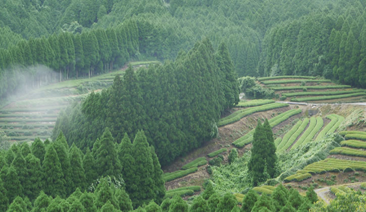 お茶作りに必要な条件。それは、気温の温暖の差、栄養満点な水と澄み切った空気それと、その茶葉達に声をかける農園のスタッフ。この天・地・人が三位一体となり、初めて良質な茶葉が育ちます。 畑は、山々に囲まれ降った雨が養分を含み茶畑へ浸透。近くには、清流が流れ水は清く美しい。天・地からの恵みと絶妙な気候の変化が、この山鹿(菊鹿)のお茶を育んでいるのです。