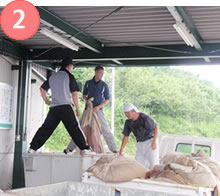 ![]() 摘んだお茶の葉を工場に運び込みます。 |